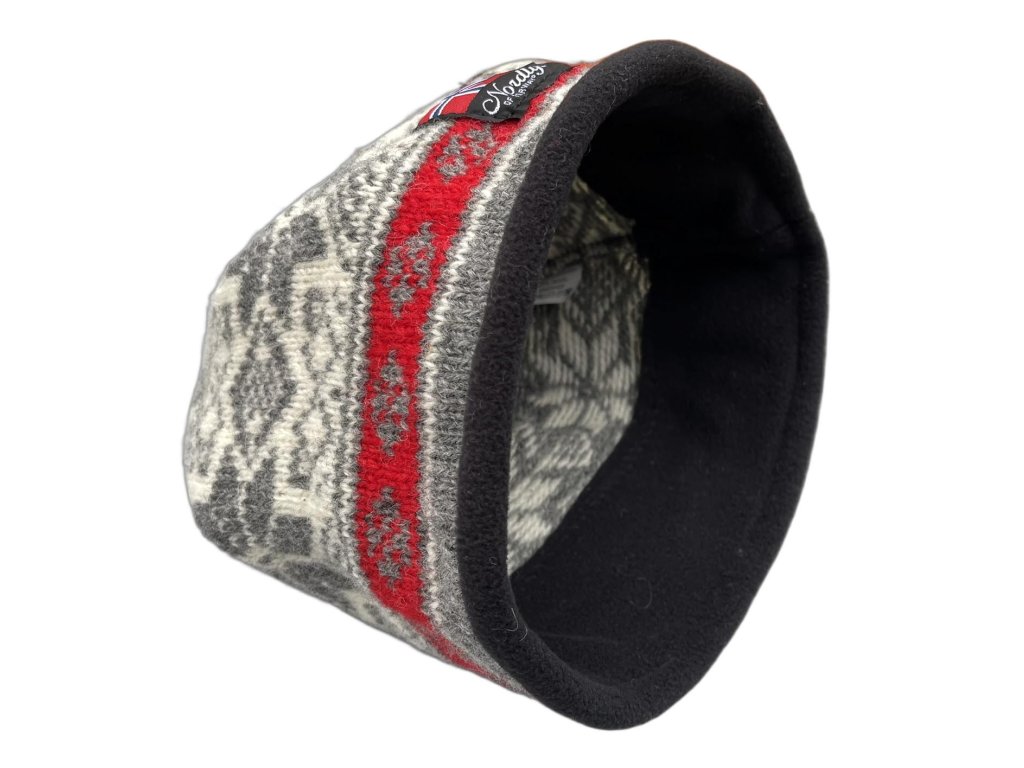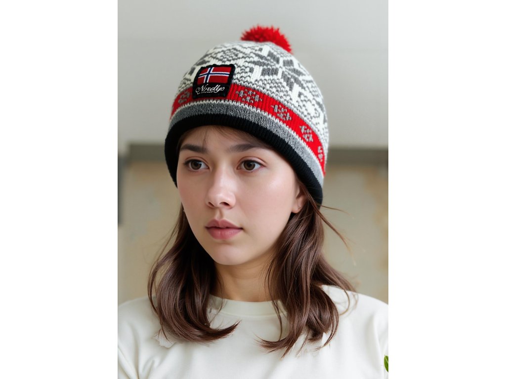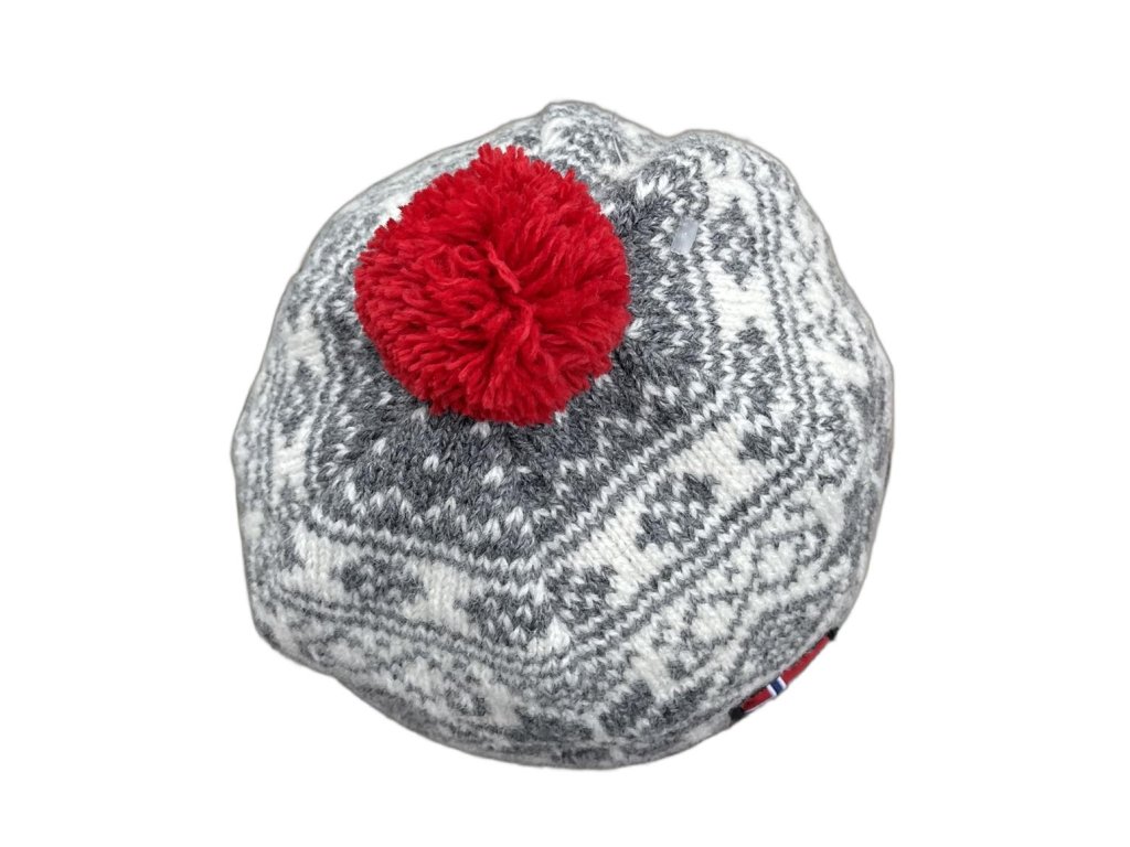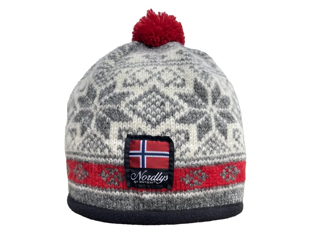 Norská zimní pletená vlněná čepice Nordlys "Mønstret " se střapcem červeno-šedá